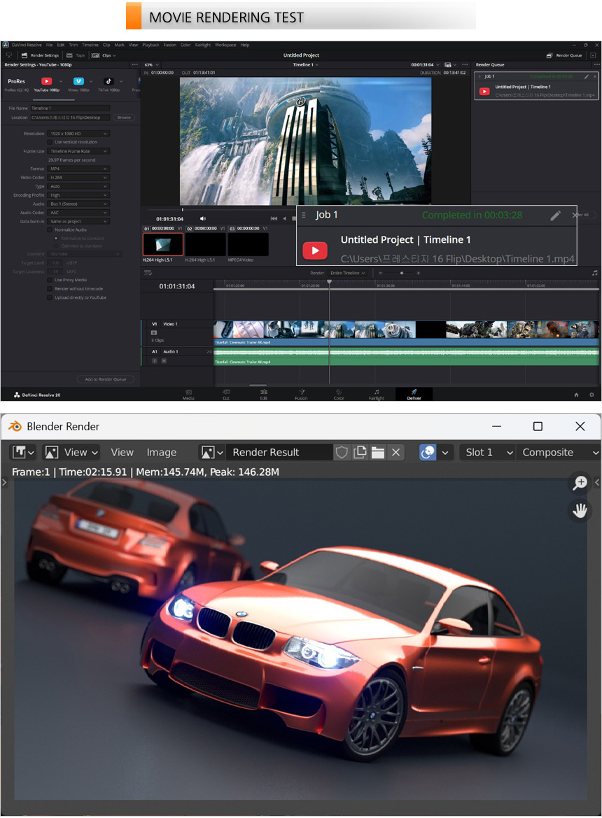 영상편집 S/W 다빈치 리졸브를 이용해 랜더링 테스트를 진행하고 있는 모습으로 (640MB, 920MB, 990MB 4K 동영상을 단일 동영상으로 랜더링, FHD 해상도에 H.264 비디오 코덱) 3분 28초가 소요되는 것을 확인할 수 있었다. 또한 CPU 사용율이 높은 블랜더 랜더링 테스트 에서도 랜더링 시간이 상당히 짧은 것을 확인할 수 있었다. @ 내장그래픽 모델임에도 외장그래픽 노트북 수준의 성능을 보여주었다.