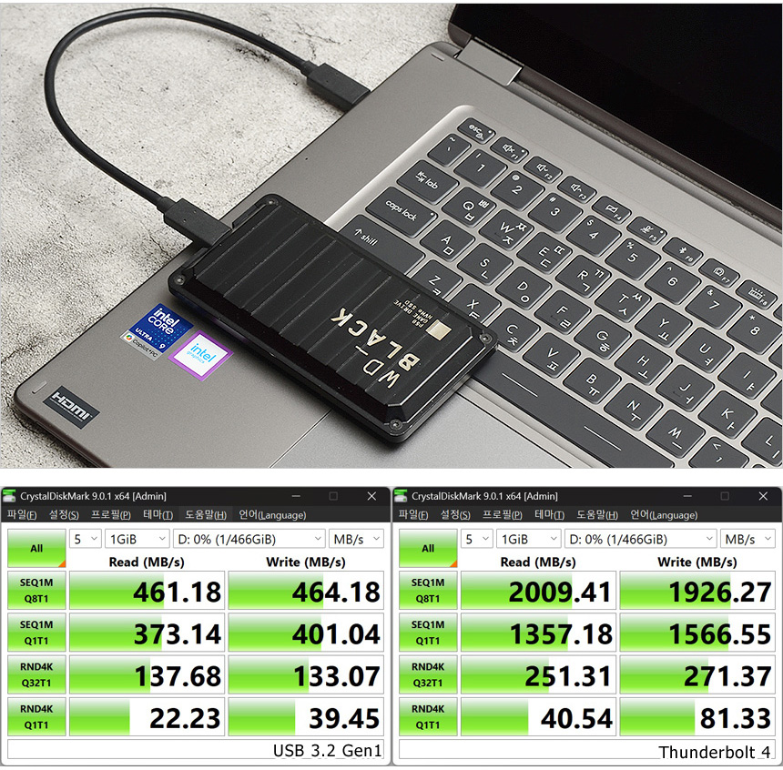 썬더볼트 4 단자를 지원해 빠른 데이터 전송이 가능하다. 상단의 사진은 외장 SSD (USB 3.2 Gen2x2 지원모델) 를 이용해 테스트를 진행하고 있는 모습으로 USB 3.2 Gen1과 확연한 차이를 보여주는 것을 확인할 수 있다.