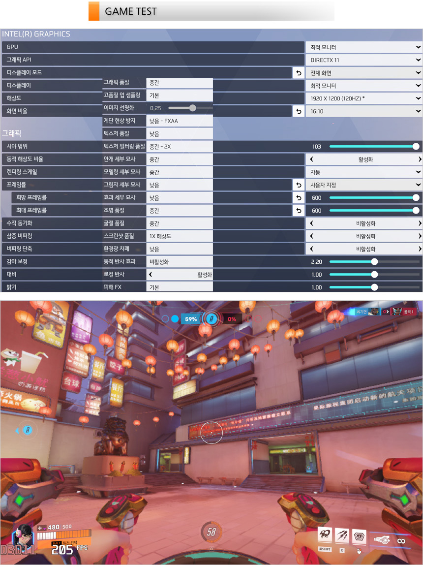 오버워치2를 플레이 하고 있는 모습으로 부드럽게 게임을 즐길 수 있었다. (135~256프레임을 보여주었다.) 120Hz 주사율 특유의 부드러움을 만끽할 수 있을 것이다. FHD+에서 테스트 했지만 더 높은 해상도에서도 충분히 게임을 즐길 수 있다.