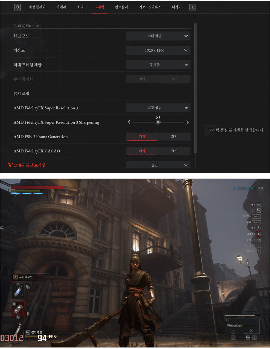 P의 거짓을 중간옵션에서 플레이 하고 있는 모습으로 FSR3 프레임 생성을 활성화 하면 FHD+ 기준 77-93 프레임을 보여주어 부드럽게 게임을 즐길 수 있었다. (동영상을 참조하기 바란다.)