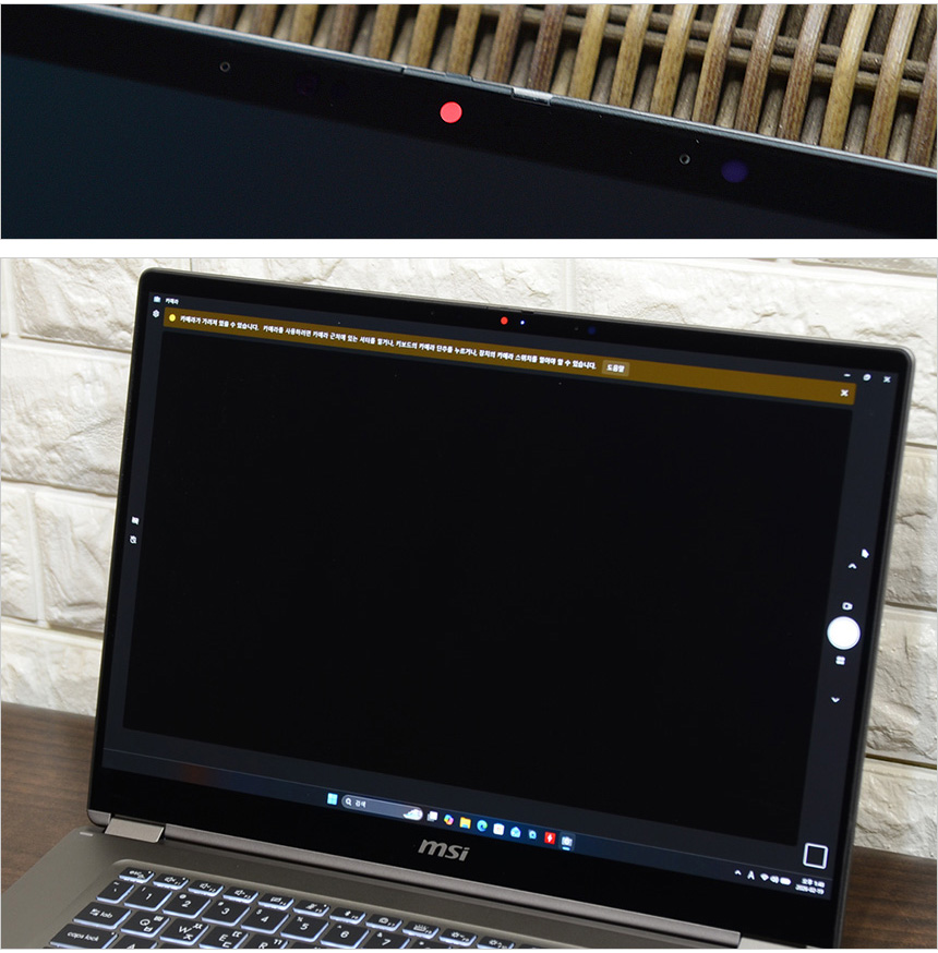 노트북에 장착된 FHD 웹캠의 화질을 확인하고 있는 모습으로 HD웹캠 기반의 일반 노트북과 확연히 비교되는 선명한 영상을 보여주었다. (디테일에서 분명한 차이를 보여주었으며 하이라이트가 날라가는 현상도 발생하지 않았다.) 화상회의는 물론 촬영 등의 용도로 유용하게 활용할 수 있을 것이다.