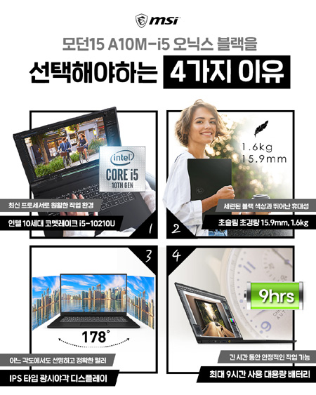 추천 가성비 상품으로 선정된 '모던15 A10M-i5 오닉스 블랙'은 인텔 10세대 i5-10210U 프로세서를 탑재하여 쾌적한 작업 환경을 제공한다.