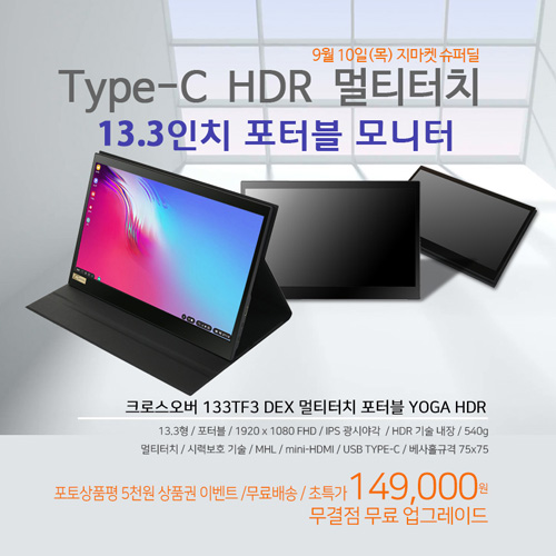 크로스오버존이 13.3형 화면에 FHD 해상도를 적용한 포터블 모니터 ‘133TF3 DEX 멀티터치 포터블 YOGA HDR’ 특가전을 진행한다.