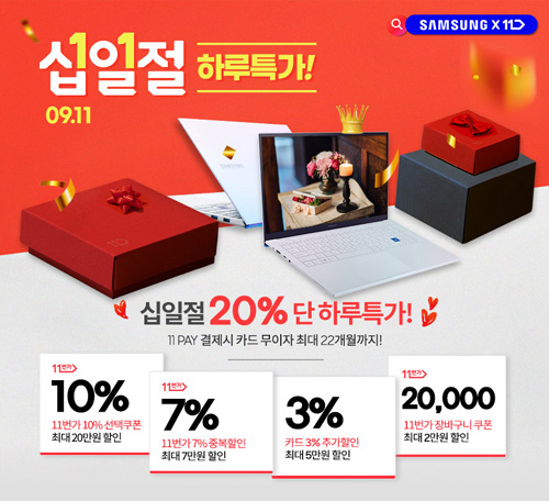 11번가에서 진행되는 이번 십일절 행사는 10% 할인 가능한 선택쿠폰(최대 20만원), 7% 할인 가능한 중복 쿠폰(최대 7만원)과 3% 할인 가능한 카드 할인(최대 5만원), 장바구니 쿠폰(최대 2만원) 혜택까지 주어져 삼성노트북 갤럭시북 인기모델(갤럭시북 이온 / 갤럭시북 플렉스 / 갤럭시북 플렉스 알파 / 갤럭시북S)을 보다 저렴한 가격으로 구매 할 수 있다.