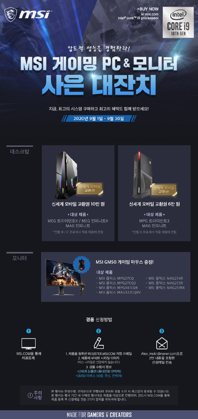 2020년 9월 1일부터 9월 30일까지 진행되는 이번 이벤트는 행사 대상 MSI 게이밍 PC를 구매하면 최대 10만 원의 신세계 상품권을, 행사 대상 게이밍 모니터는 MSI 정품 게이밍 마우스, ‘GM50’이 사은품으로 제공될 예정이다.