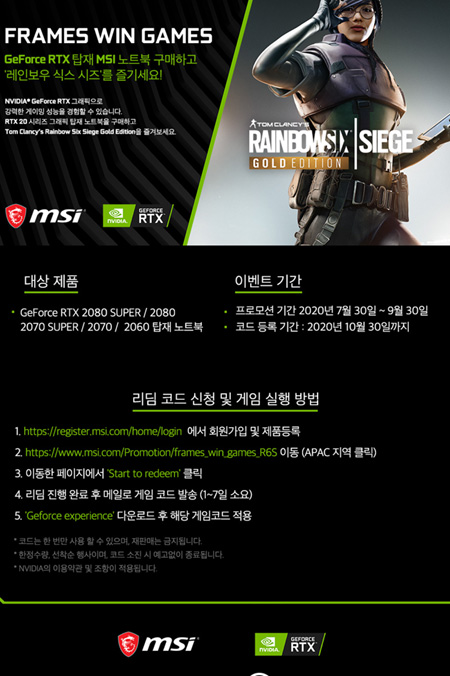 엠에스아이코리아는 RTX 그래픽 탑재 MSI 노트북 구매자를 대상으로 '레인보우 식스 시즈 골드 에디션' 리딤 코드를 증정하는 이벤트를 진행한다.