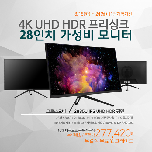 크로스오버존이 성능은 높이고 가격은 합리적인 수준으로 낮춘 28형 4K UHD 모니터인 ‘2885U IPS UHD HDR 평면’을 대상으로 특가 행사를 진행한다.