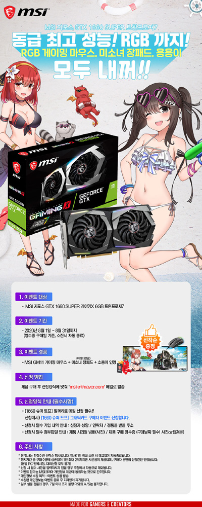 엠에스아이코리아는 ‘MSI 지포스 GTX 1660 SUPER’ 그래픽카드 구매자에게 RGB 게이밍 마우스, MSI 미소녀 장패드, 용용이 인형 등 경품을 증정하는 이벤트를 진행한다.