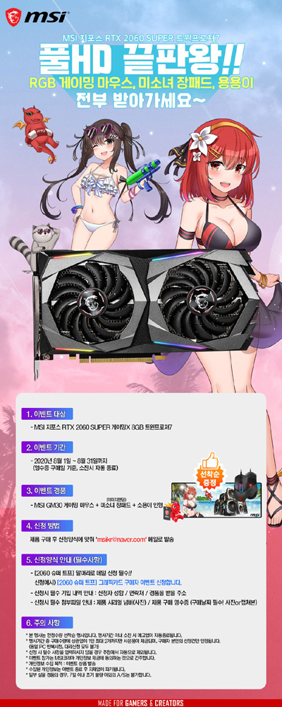 엠에스아이코리아는 ‘MSI 지포스 RTX 2060 SUPER 게이밍X 트윈프로져7’ 그래픽카드 구매자에게 RGB 게이밍 마우스, MSI 미소녀 장패드, 용용이 인형 등 경품을 증정하는 이벤트를 진행한다.