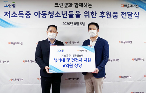 크린랲은 아동 및 청소년 취약계층을 위해 건전지 및 생리대 제품 총 6억원 상당의 생필품을 국제개발협력 NGO 단체인 지파운데이션에 기탁하고, 5일 지파운데이션 본사에서 전달식을 가졌다.