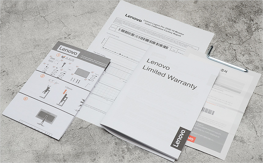풀KIT 의 모습으로 최상급 모델답게 구성품이 다양한 것을 확인할 수 있다. 모니터를 비롯해 전원 케이블과 DP/HDMI/C타입 케이블이 제공되며 보증서와 퀵 매뉴얼, 캘리브레이션 차트 등을 지원한다. 또한 스탠드 조립을 위한 8개의 볼트와 드라이버도 포함되어 있다.