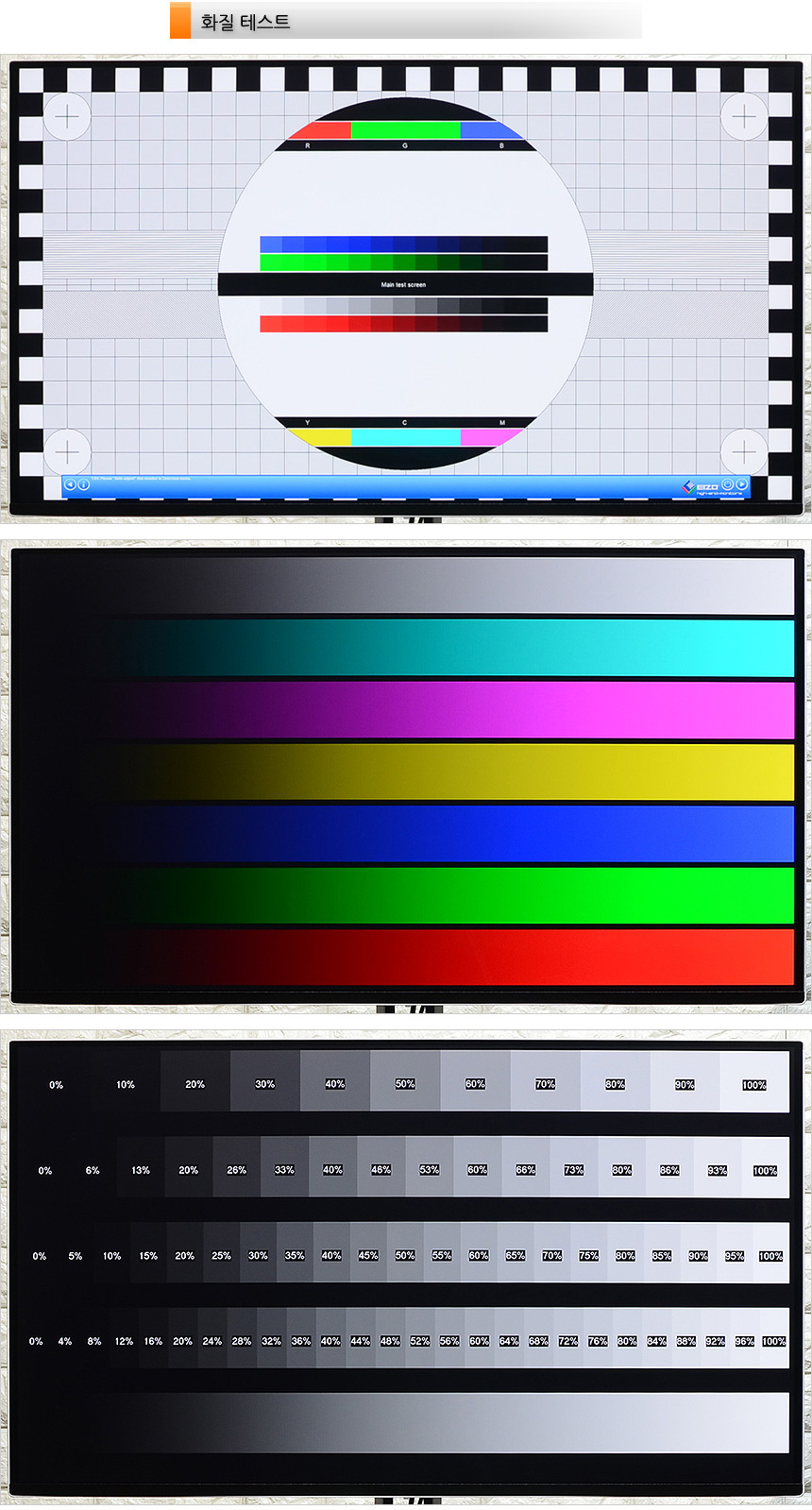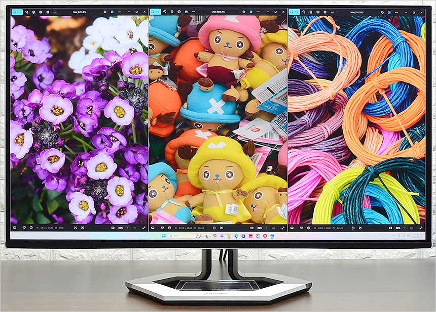 테스트 프로그램을 이용해 영상을 확인하고 있는 모습으로 QD-OLED 패널을 사용한 모델답게 원색과 블랙 표현이 상당히 인상적이었으며 4K 해상도 특유의 높은 디테일이 무척 마음에 들었다. 일반 모니터와 확연히 비교되는 1,500,000 : 1 의 높은 명암비를 지원해 사진의 그레이스케일 차트를 확연하게 구분할 수 있었다. 사진편집시 명암비가 상당히 중요한데 이 제품은 높은 명암비를 지원해 사진편집도 원활하게 실행할 수 있다.
