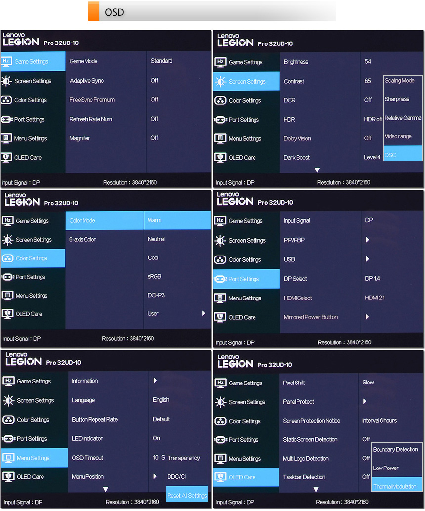 OSD 의 모습으로 화면과 게임 설정을 비롯해 컬러, 포트 등 다양한 설정이 제공되는 것을 확인할 수 있다. 특히 디스플레이 부분에서 강조한 것과 같이 OLED 케어 기술이 적용되어 OLED 패널의 최대문제인 번인등으로 인한 걱정없이 모니터를 사용할 수 있다.