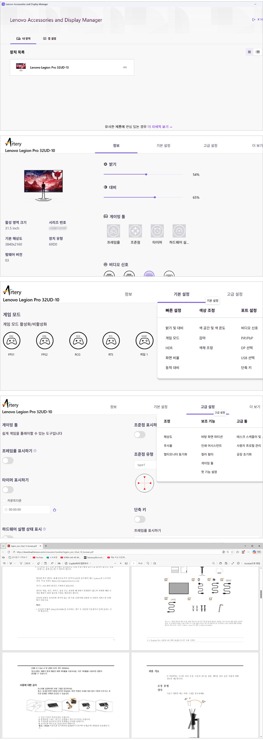 MS 스토어에서 디스플레이 매니져 S/W를 설치해 사용할 수 있다. (기존에 S/W가 설치되어 있다면 꼭 업데이트를 진행하기 바란다. 최신 업데이트 상태에서만 인식되기 때문이다.) 상단의 사진은 레노버 디스플레이 매니저를 실행한 모습으로 시스템 정보가 표시되며 밝기와 명암비, 입력소스, 색공간 등을 빠르게 조정할 수 있으며 게이밍 모니터 답게 다양한 게임관련 기능이 제공되는 것을 확인할 수 있다. 기본기능과 고급기능으로 구분되며 사용설명서도 제공해 손쉽게 사용법을 숙지할 수 있다.