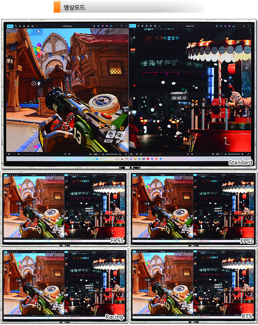 다양한 게임모드 지원으로 즐기는 게임에 최적화된 영상을 즐길 수 있다. 상단의 사진은 지원 모드를 비교한 모습으로 영상의 밝기가 확연하게 달라지는 것을 확인할 수 있었다. 게임에 따라 일일이 밝기를 조절해야 하는 모니터들과 달리 전용 S/W 통해 게임 실행중에도 손쉽게 모드를 조정할 수 있다.