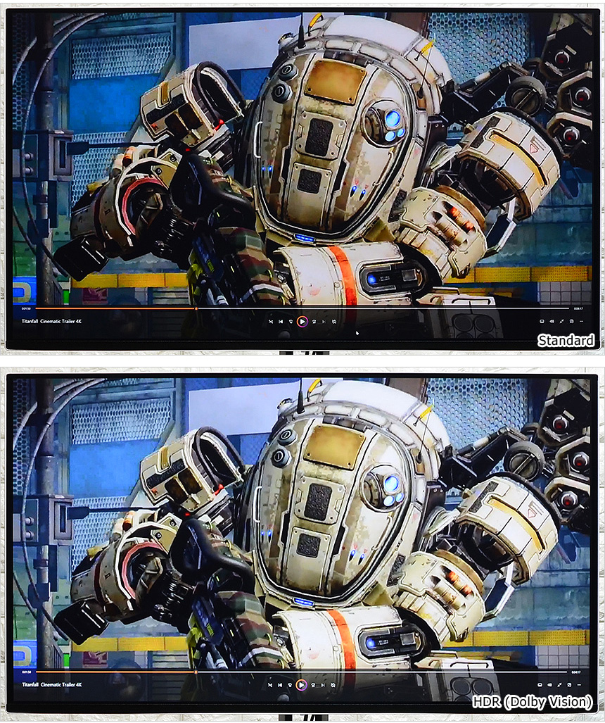 명암비와 색 표현 범위를 확장해 더 현실적이고 생생한 화면을 보여주는 HDR 기술을 지원한다. 다양한 메뉴를 OSD에서 제공할 뿐만 아니라 돌비 비전 설정이 가능해 더 선명한 HDR 영상을 즐길 수 있다. (참고로 돌비비전은 HDR 활성화 상태에서만 실행할 수 있다.)