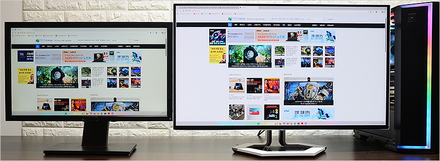 깜빡임으로 인한 눈의 피로를 줄이기 위해 플리커 프리 기술을 지원하고 있다. 상단의 사진은 일반 모니터를 추가로 연결한 모습으로 눈으로 보기에 큰 차이가 없는 것을 확인할 수 있다.