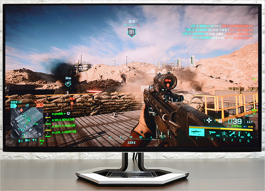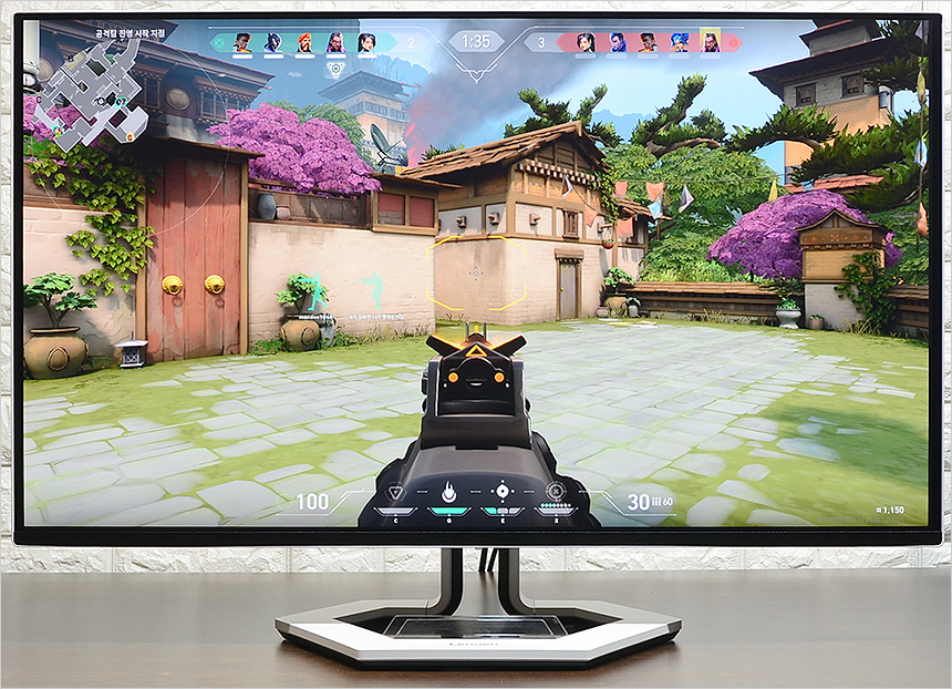 또한 최상급 QD-OLED 패널을 사용한 모델답게 LCD 모니터에서는 느낄 수 없었던 진한 색감을 보여 주었으며 FPS 등의 게이밍 모드를 지원해 어두운 실내에서도 캐릭터와 배경을 구분할 수 있었다. 뿐만 아니라 암부도 뭉개지지 않고 정확하게 표현해 주었으며 조준선을 지원해 사격 정확성을 높일 수 있었다. (참고로 배틀로얄 류의 게임을 위해 타이머도 지원한다.)