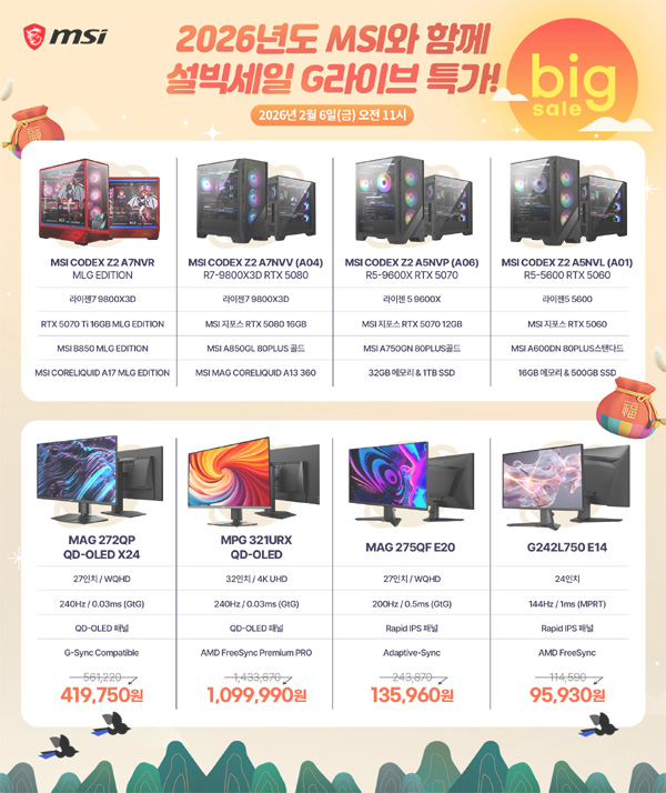 엠에스아이코리아는 2월 6일(금) 오전 11시부터 12시까지, G마켓 라이브 방송을 통해 MSI 게이밍 데스크탑, 모니터 및 노트북을 대상으로 한정 프로모션을 진행한다.