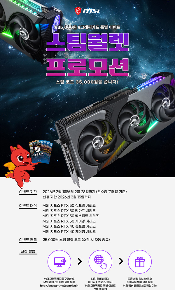 MSI가 2월 28일까지 그래픽카드를 구매한 고객을 대상으로 35,000원 스팀 월렛 코드를 증정하는 프로모션을 진행한다.