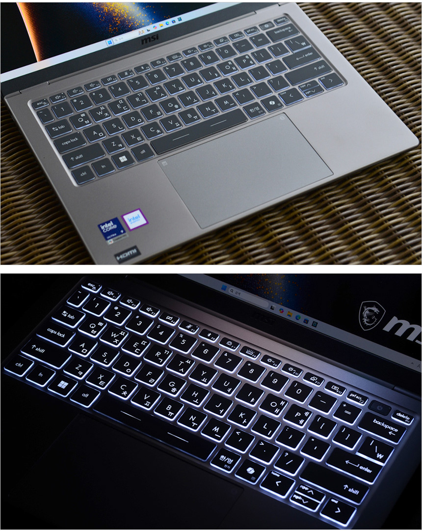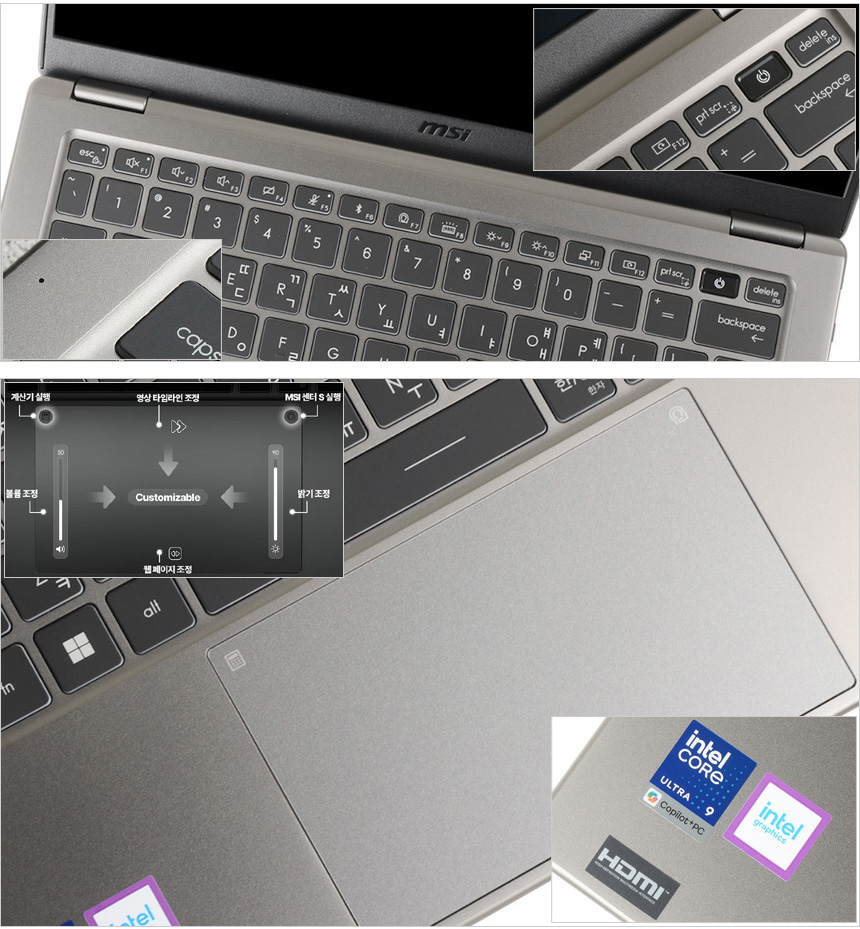 키보드 1열에는 밝기와 볼륨, 키보드 백라이트, 화면회전 등을 손쉽게 설정할 수 있는 다양한 핫키가 제공되며 전원 버튼에 지문인식 센서가 장착되어 보안성과 편의성을 높였다. (전원 버튼은 쉽게 눌리지 않도록 디자인 되었다.) 또한 디스플레이 부분에서 언급한 것과 같이 측면에 마이크가 설치된 것도 확인할 수 있다. (AI 노이즈 캔슬링 프로가 적용되어 있다. AI가 주변소음을 제거하고 사용자의 음성을 또렸하게 분리해 전달해 준다.