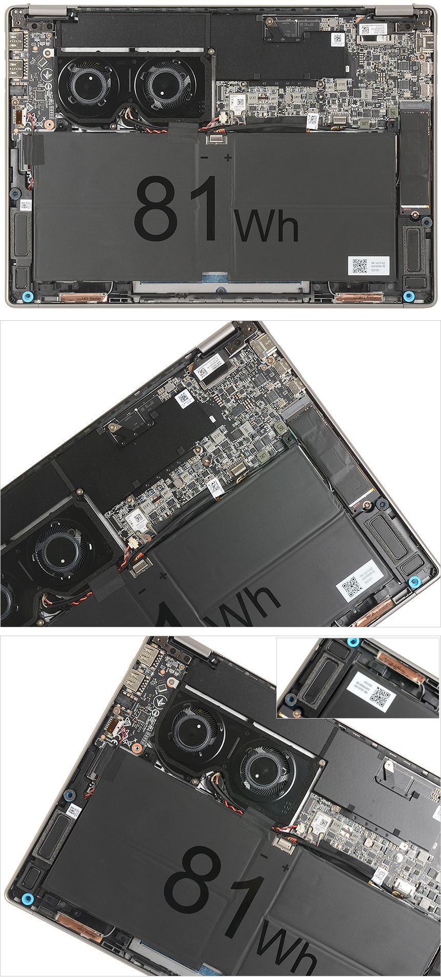 바닥면 내부의 모습으로 상단에서 언급한 것과 같이 CPU와 전원부의 열을 식혀주기 위해 베이퍼 챔버 쿨러가 장착되어 있으며 하단에는 81Wh 대용량 리튬이온 배터리를 비롯해 스피커와 마그네틱, 무선랜 안테나 등이 설치된 것을 확인할 수 있다. 32GB LPDDR5x 메모리가 온보드로 제공되며 1TB PCIe 4.0 NVMe SSD를 탑재해 빠른 속도를 경험할 수 있다. 또한 Wi-Fi 6 무선랜을 지원하는 구형 노트북들과 달리 킬러 Wi-Fi 7 무선랜카드가 설치되어 더 빠른 무선속도를 즐길 수 있다.
