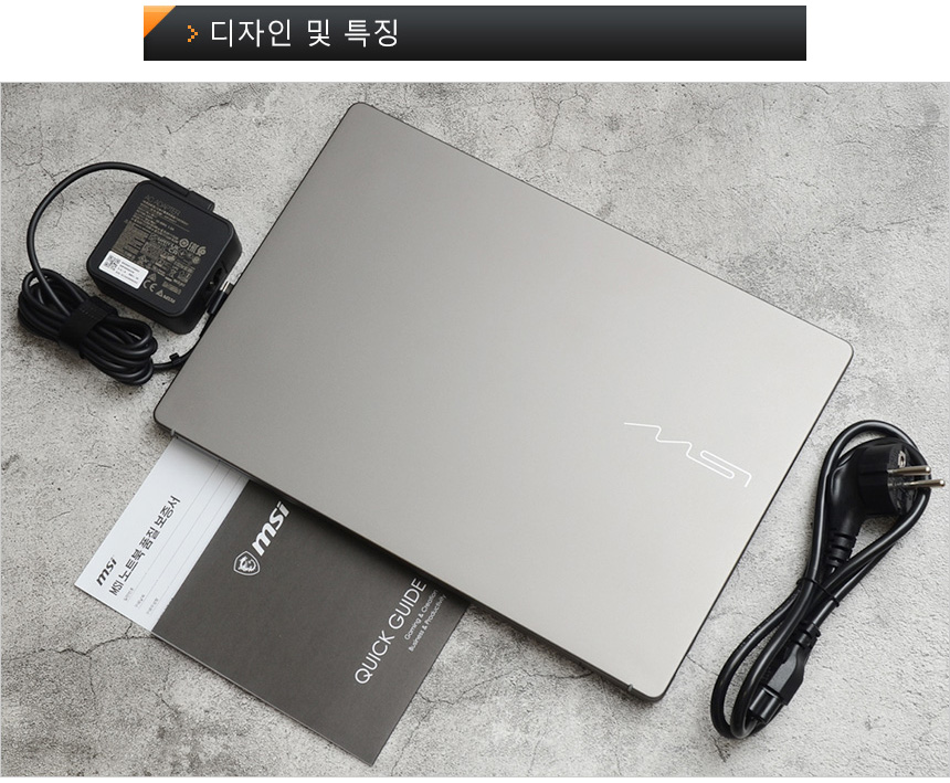 풀KIT 의 모습으로 노트북을 비롯해 C타입 65W 전원 어댑터와 전원 케이블이 제공되며 보증서와 퀵 매뉴얼이 포함되어 있다.
