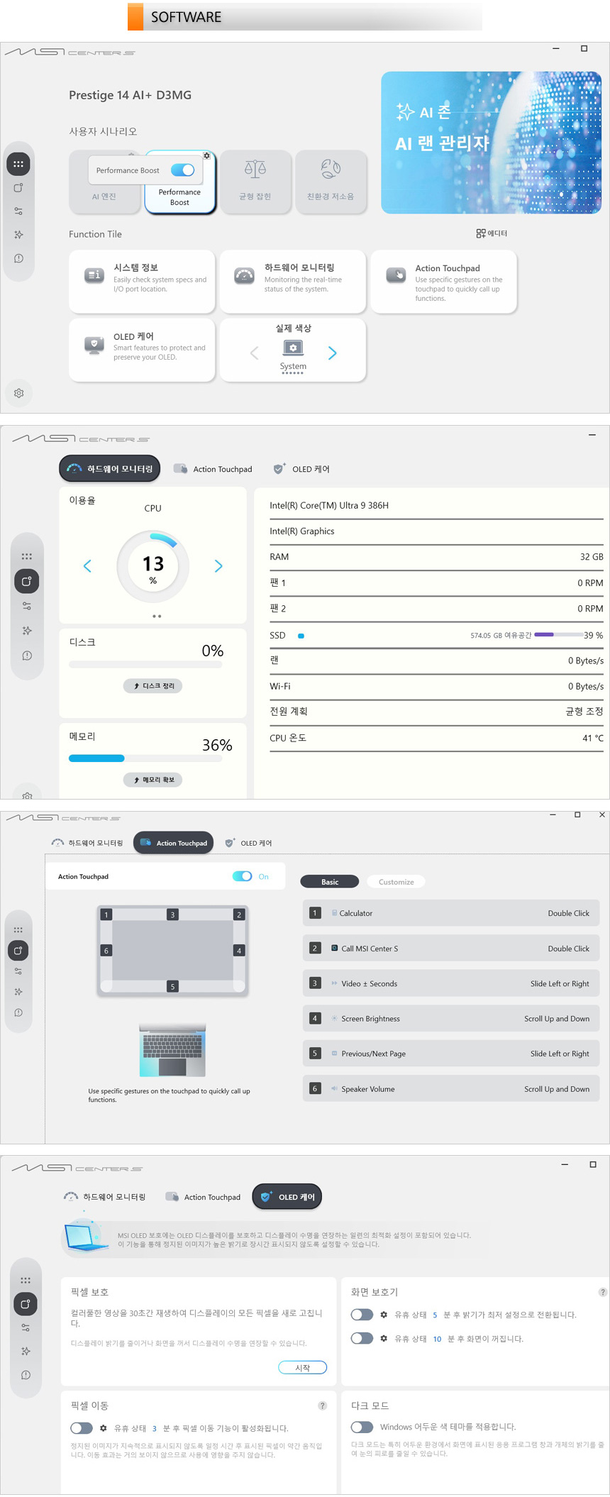 전용 S/W인 MSI 센터S 가 새로운 스타일로 변신한 것을 확인할 수 있다. 메인화면에서 퍼포먼스를 비롯한 중요설정을 조정할 수 있고 시스템 모니터링과 OLED 케어 설정이 가능하며 액션 터치패드 설정도 지원한다. (커스텀 설정이 가능해 사용자가 임의대로 기능을 지정할 수 있다.)