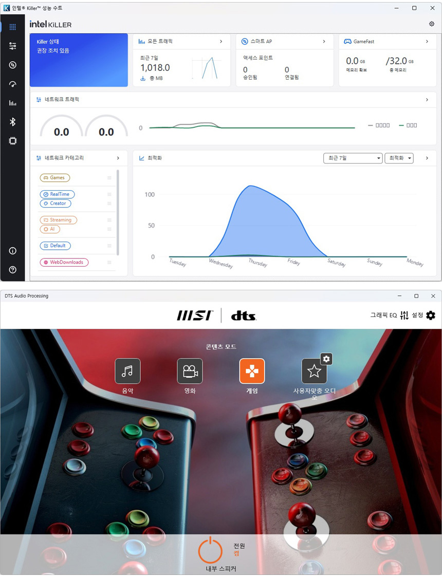 다양한 프로파일을 제공하는 DTS 오디오 지원으로 사용자에 맞는 사운드를 즐길 수 있으며 킬러 무선랜을 지원하는 모델답게 설정을 위한 전용 S/W를 제공한다.