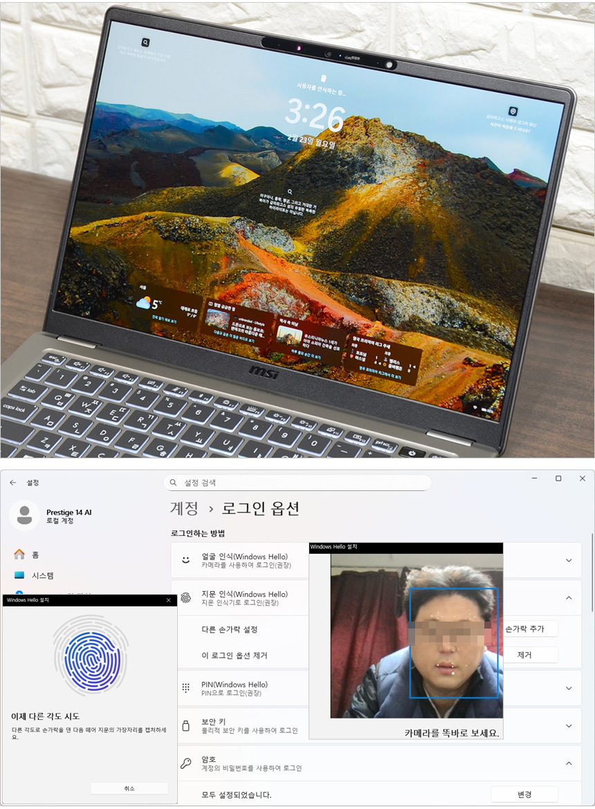프리미엄 비즈니스 노트북 답게 인체감지 기술을 제공한다. 사용자가 자리를 비우면 화면이 자동으로 꺼지며 다시 자리로 오면 절전 모드가 해제되어 보안성과 편의성을 한층 높일 수 있다. @ 이 기능은 얼굴인식과 함께 사용하는 것을 적극 권장한다. 외부에서 자리를 비우면 자동으로 화면이 꺼지며 노트북이 잠금 상태가 되며 사용자가 자리에 앉으면 얼굴을 인식해 자동으로 켜지며 로그인 된다. 인체감지 설정은 설정->개인정보 및 보안->존재감지->존재감지 설정에서 셋팅할 수 있다. (동영상을 확인하기 바란다. 어떻게 동작하는지 쉽게 이해할 수 있을 것이다.)