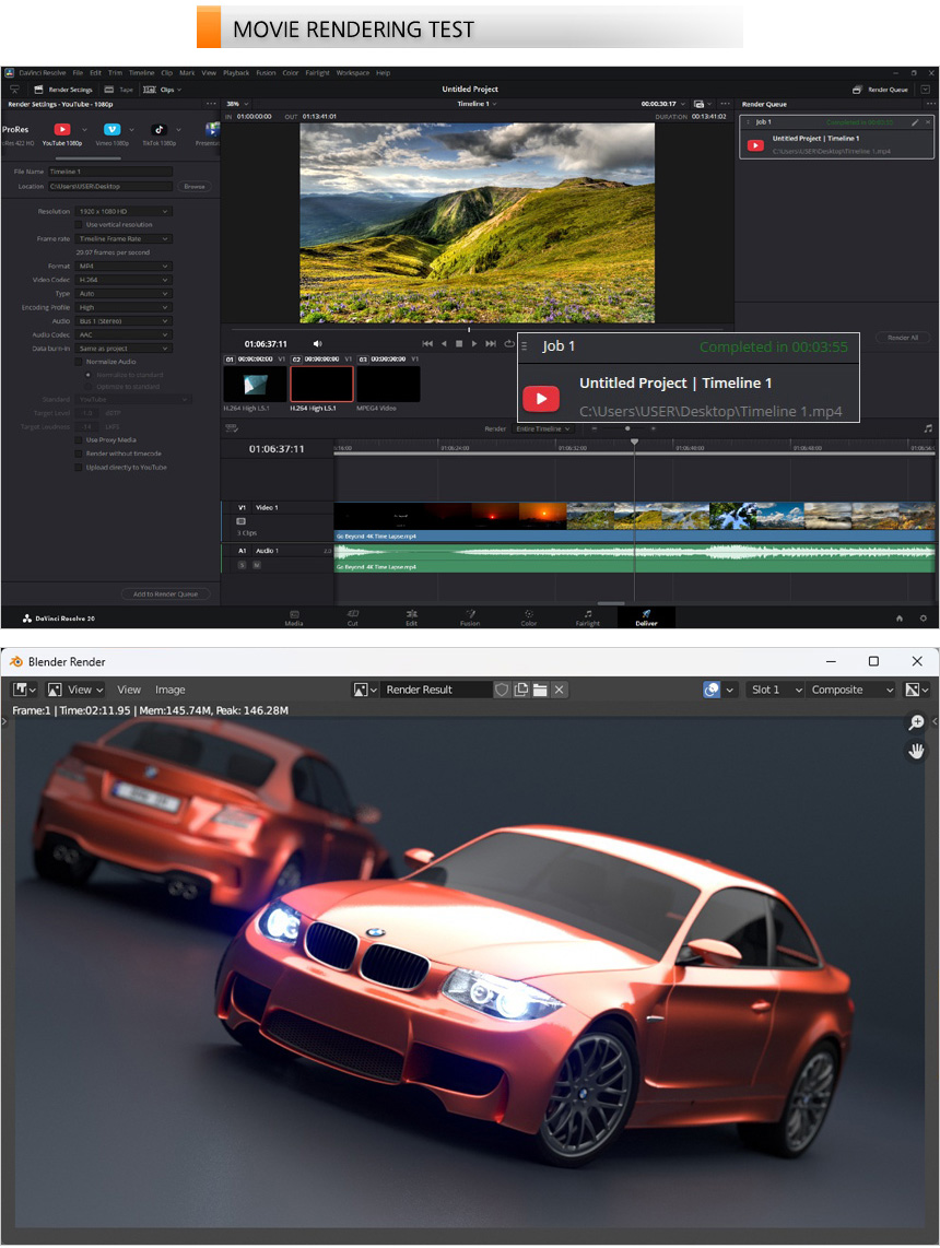 영상편집 S/W 다빈치 리졸브를 이용해 랜더링 테스트를 진행하고 있는 모습으로 (640MB, 920MB, 990MB 4K 동영상을 단일 동영상으로 랜더링, FHD 해상도에 H.264 비디오 코덱) 3분 55초가 소요되는 것을 확인할 수 있었다. 또한 CPU 사용율이 높은 블랜더 랜더링 테스트 에서도 랜더링 시간이 2분대로 상당히 짧은 것을 확인할 수 있었다. @ 내장그래픽 모델임에도 보급형 크리에이터 노트북 수준의 성능을 보여주었다.