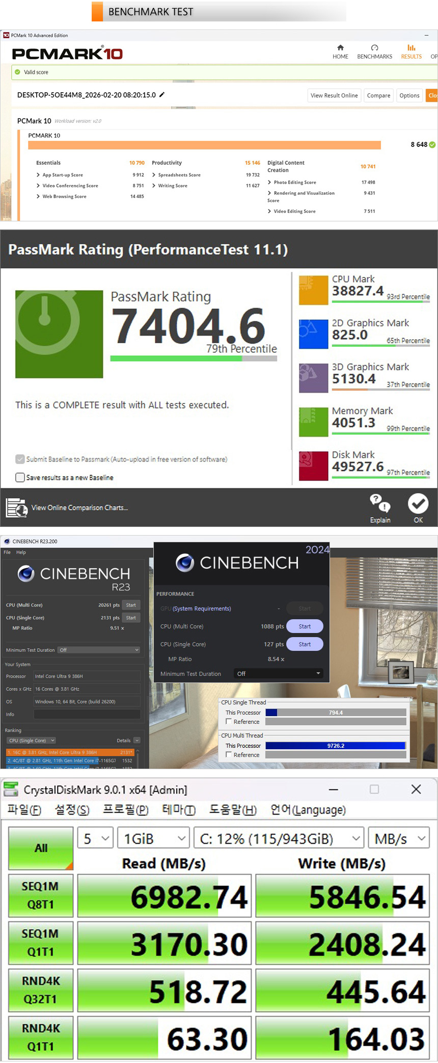 벤치마크 프로그램을 이용해 노트북의 성능을 확인하고 있는 모습으로 CPU 스코어가 상당히 높은 것을 확인할 수 있었다. 메모리 용량도 넉넉해 전문가용 S/W를 더 부드럽게 실행할 수 있다. 또한 저장장치의 속도를 확인해 보았는데 PCIe 4.0 지원 SSD 답게 7000MB/s 에 육박하는 빠른 속도를 보여주었다. (용량도 1TB로 넉넉해 여유롭게 데이터를 저장할 수 있다.)