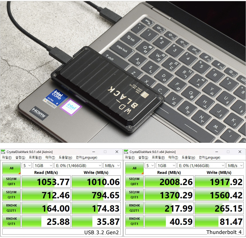 썬더볼트 4 단자를 지원해 빠른 데이터 전송이 가능하다. 상단의 사진은 외장 SSD (USB 3.2 Gen2x2 지원모델) 를 이용해 테스트를 진행하고 있는 모습으로 USB 3.2 Gen2와 확연한 차이를 보여주는 것을 확인할 수 있다.
