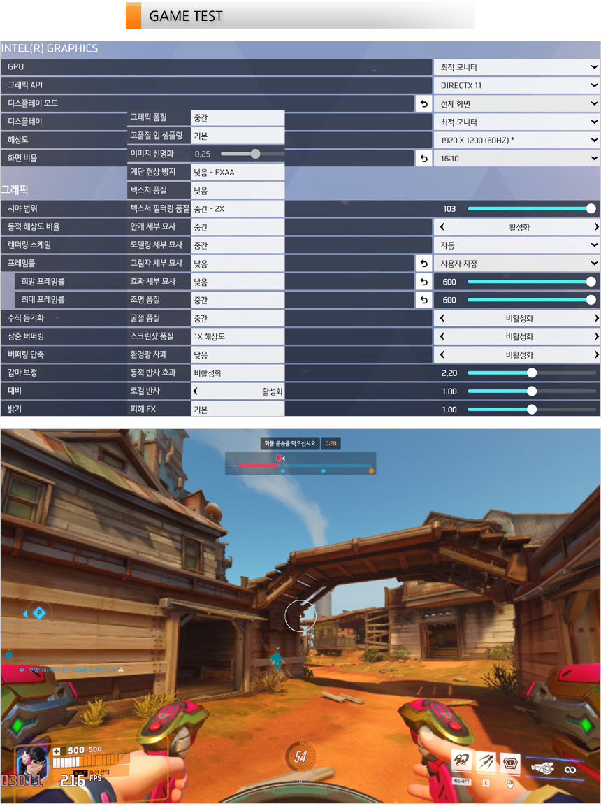 오버워치2를 플레이 하고 있는 모습으로 부드럽게 게임을 즐길 수 있었다. (147~226프레임을 보여주었다.) FHD+에서 테스트 했지만 더 높은 해상도에서도 충분히 게임을 즐길 수 있다.
