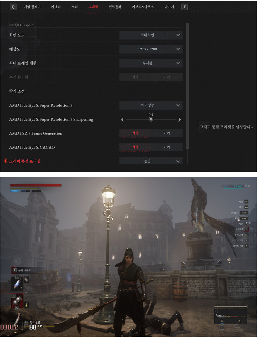 P의 거짓을 중간옵션에서 플레이 하고 있는 모습으로 FSR3 프레임 생성을 활성화 하면 FHD+ 기준 76-95 프레임을 보여주어 부드럽게 게임을 즐길 수 있었다. (동영상을 참조하기 바란다.)