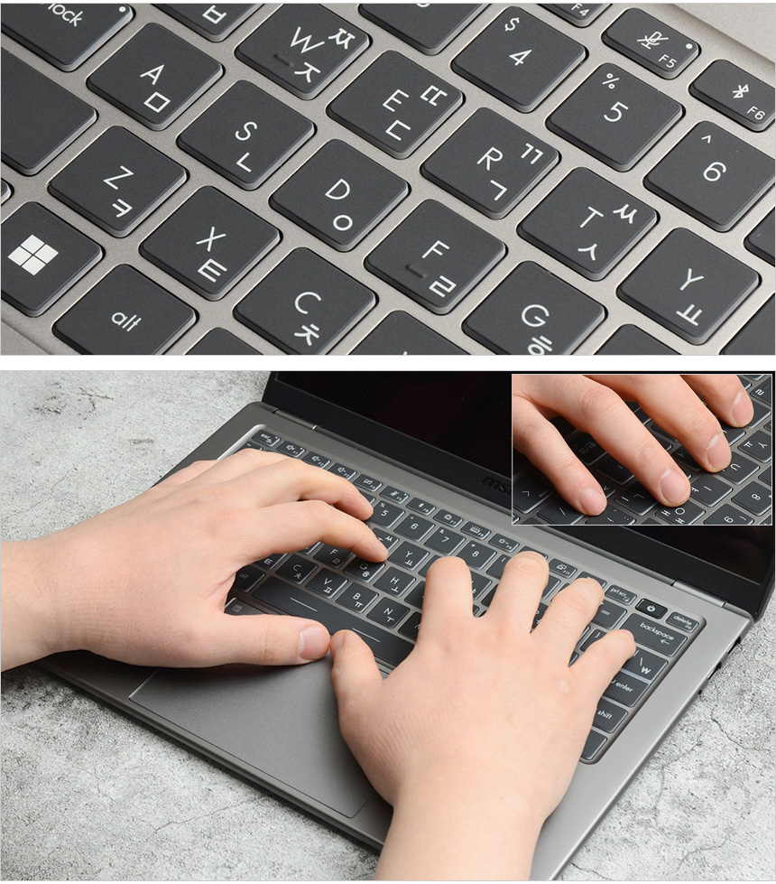 타이핑 테스트를 진행하고 있는 모습으로 컴팩트 노트북이지만 팜래스트 공간이 넓어 손을 여유롭게 올려두고 편하게 타이핑 할 수 있었다. 키간격도 넓은 편으로 오타없이 고속 타이핑이 가능했으며 키압이 낮고 긴 트래블과 높은 탄력으로 손가락의 부담없이 타이핑 할 수 있었다. 장시간 타이핑 작업으로 해야하는 직장인이나 대학생이 편하게 사용할 수 있을 것이다.