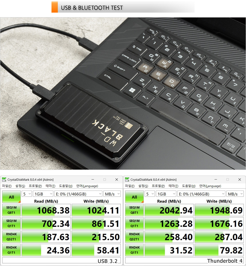 썬더볼트 4 단자를 지원해 빠른 데이터 전송이 가능하다. 상단의 사진은 외장 SSD를 이용해 USB 3.2 단자와 비교한 모습으로 속도차가 큰 것을 확인할 수 있었다. @ 참고로 외장 SSD 는 USB 3.2 Gen2x2 지원 모델이다.