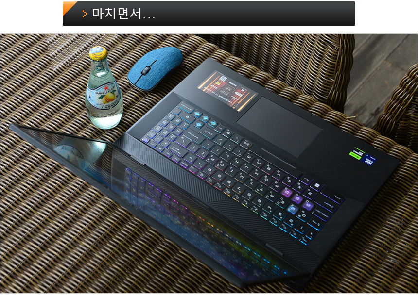 풀KIT 의 모습으로 노트북을 비롯해 240W 전원 어댑터와 전원 케이블을 제공하며 퀵 매뉴얼과 보증서가 포함되어 있다. 또한 전용 백팩을 제공해 편하게 휴대할 수 있으며 게이밍 마우스도 지원한다.