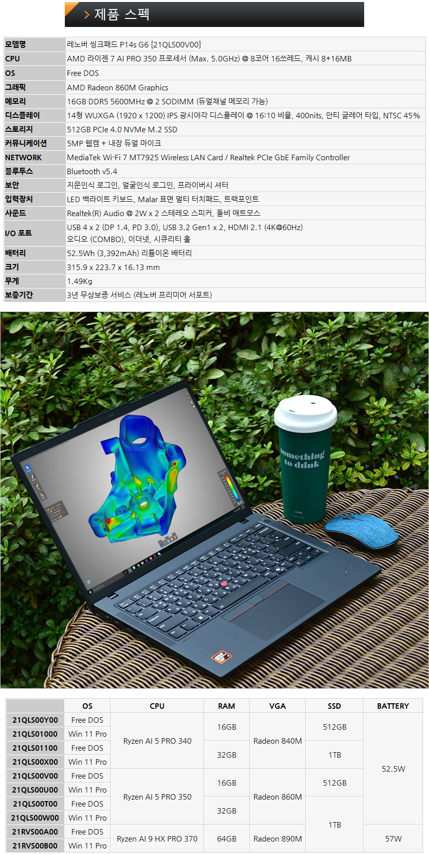 레노버 씽크패드 P14s G6 시리즈는 다양한 모델로 출시되고 있다. (전문가들의 요구조건이 상당히 까다로운 편이기 때문에 사용자에 맞는 모델을 편하게 선택할 수 있도록 제품을 다양화 한 것이다.) 3개의 프로세서로 출시되고 그에 따라 내장그래픽이 달라지며 메모리나 저장장치의 용량도 원하는 대로 선택할 수 있다. 또한 OS도 윈도우 11 Pro 뿐만 아니라 프리도스도 지원하고 있다.