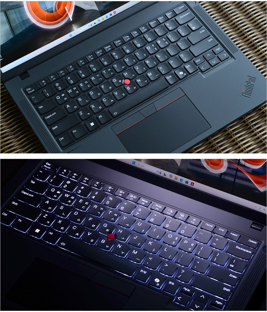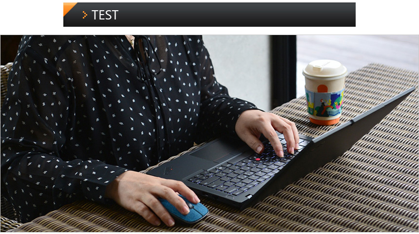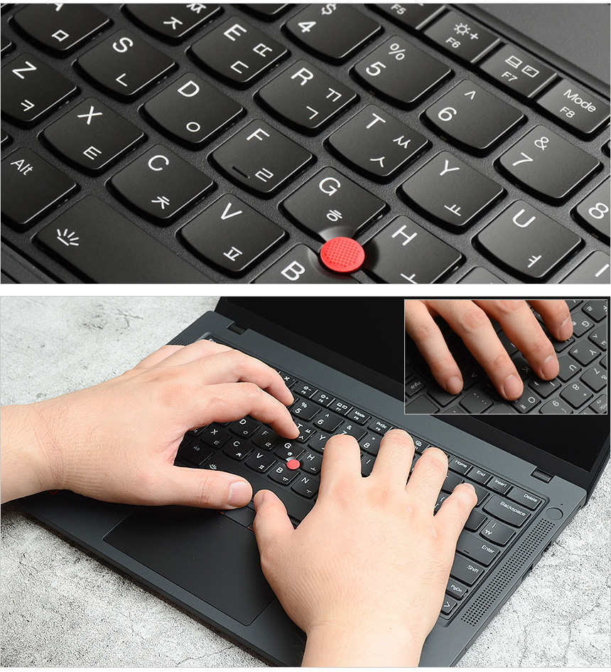 타이핑 테스트를 진행하고 있는 모습으로 손가락이 자연스럽게 닿을 수 있도록 키가 유선형으로 설계되어 있으며 씽크패드 다운 깊은 Depth 와 낮은 키압, 확연한 구분감이 더해져 손가락의 부담없이 장시간 타이핑 할 수 있다. 또한 팜래스트 면적도 넉넉해 손목등의 피로감을 최소화 한다. 타이핑이 많은 직장인이나 대학생들이라면 만족스럽게 사용할 수 있을 것이다.