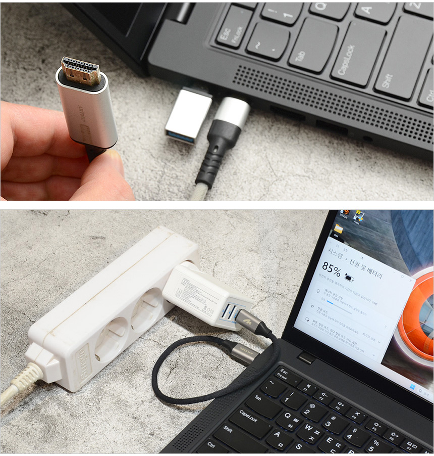 GaN (질화갈륨) 충전기를 적용한 것도 특징이라 할 수 있다. 실리콘 기반의 일반적인 충전기 대비 빠은 충전이 가능하며 열 발생이 적어 과열로 문제 가능성을 최소화 한다. 뿐만 아니라 에너지 손실이 적어 전기 요금을 줄일 수 있으며 부품 수명이 길어 안정적으로 노트북을 사용할 수 있다.