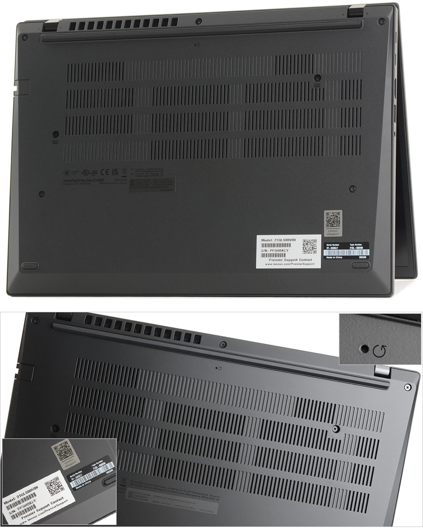 노트북 바닥면의 모습으로 공기가 원할하게 유입될 수 있도록 통풍구가 설치된 것을 확인할 수 있으며 사방에는 고무패드가 부착되어 미끄러짐을 방지한다. 또한 리셋 버튼도 제공되어 노트북 문제가 발생했을 때 빠르게 조치를 할 수 있다.