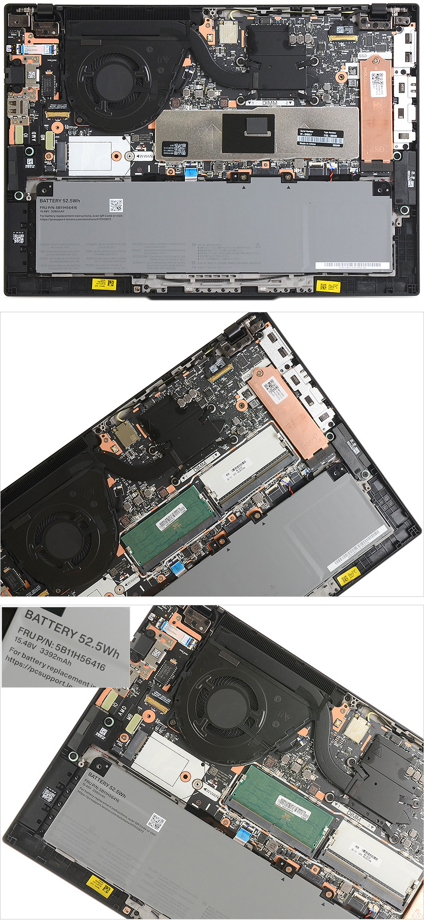 노트북 내부의 모습으로 팬과 히트파이프가 상단에 설치되어 있고 하단에는 3392mAh 용량의 리튬이온 배터리가 부착되어 있다. 또한 측면에는 512GB PCIe 4.0 NVMe M.2 SSD가 장착되어 있고 (히트싱크를 추가해 안정성을 높였다.) WAN 활용을 위한 M.2 슬롯이 제공된다.