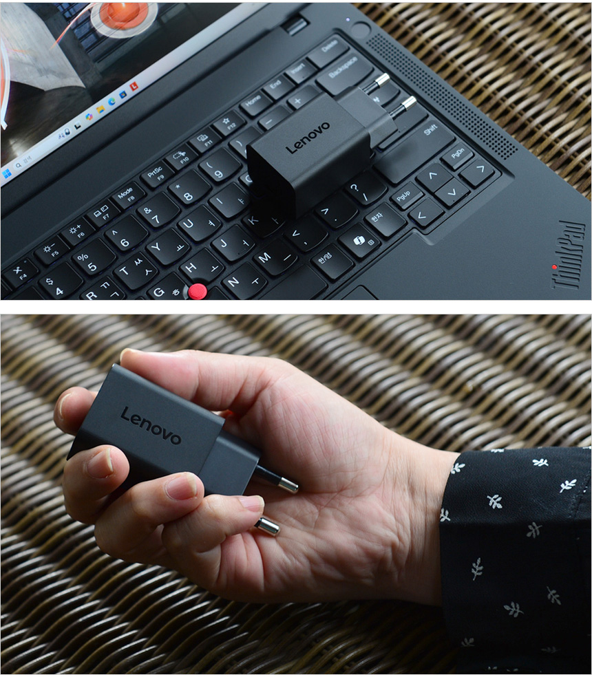 레노버 씽크패드 P14s G6 은 작은 전원 어댑터를 제공해 더 뛰어난 휴대성을 제공한다. 기존의 전원 어댑터는 크기가 크고 별도로 전원 케이블까지 휴대해야 했기 때문에 들고 다닐때 불편을 느낄 수밖에 없었던데 반해 기본 제공되는 전원 어댑터는 한손에 쏙 들어오는 작은 크기를 가지고 있으며 C타입 케이블만 연결하면 사용이 가능해 편하게 휴대할 수 있다.