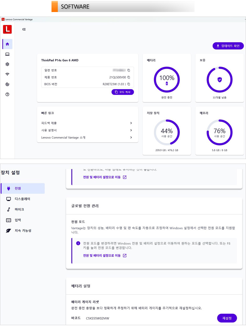레노버 관리 S/W인 커머설 Vantage의 실행 모습으로 시스템 업데이트가 가능하며 전원 및 오디오/영상, 입력장치 등의 디테일한 설정을 지원한다. (노트북 구입후 반드시 설치해 하드웨어 설정을 사용자에 맞게 조정하기 바란다.) @ 레노버 밴티지를 설치하는 컨슈머 노트북들과 달리 기업 환경에 특화된 모델로 커머셜 밴티지를 설치했다. (자세한 사항은 동영상을 참조하기 바란다.)