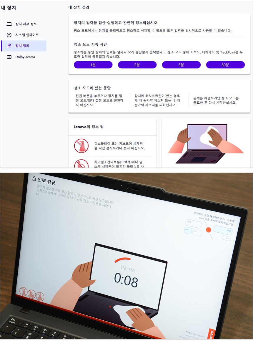 코로나 재확산으로 인해 개인위생에 대한 중요성이 부각되고 있다. 이 제품은 노트북이 켜진 상태에서도 편하게 청소할 수 있는 크리너 기능을 지원해 (S/W가 실행되는 동안은 키를 눌러도 입력되지 않는다.) 회의나 미팅 후 편하게 노트북을 청소할 수 있다. (동영상을 통해 확인하기 바란다.)
