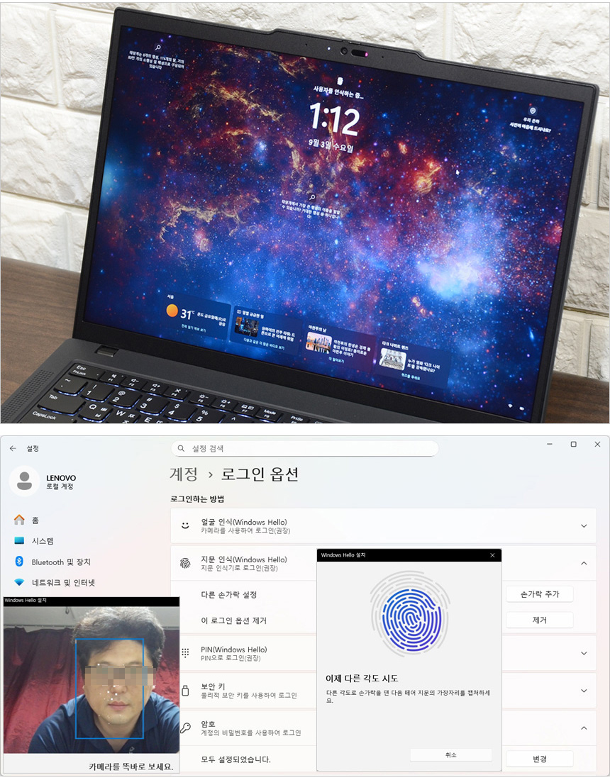 IR카메라와 지문인식 센서를 장착해 보안성을 높인 제품으로 윈도우즈 헬로를 통해 비밀번호와 핀번호 생성 후 지문과 얼굴을 등록할 수 있다. 인식율이 뛰어나 편하게 사용할 수 있을 것이다. (동영상을 통해 자세히 확인하기 바란다.)