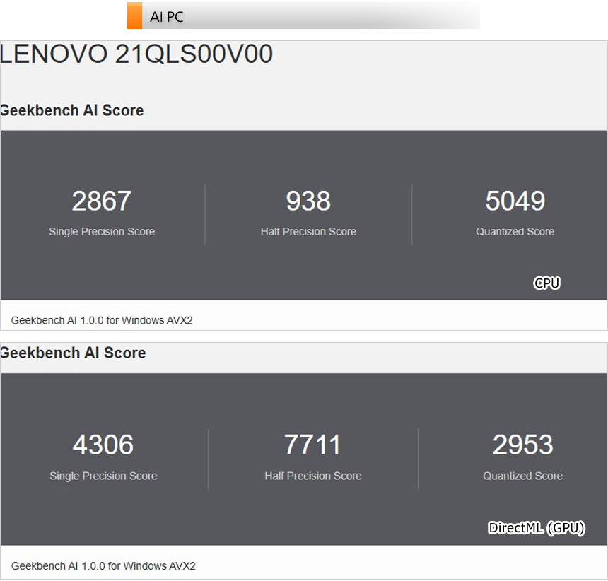 AI 전용 벤치마크 툴을 이용해 AI 성능 테스트를 진행하고 있는 모습으로 고성능 CPU 탑재 모델답게 높은 스코어를 보여주었다. (AI를 통한 개발이나 생성형 AI 용도로 유용하게 사용할 수 있는 노트북이다.)