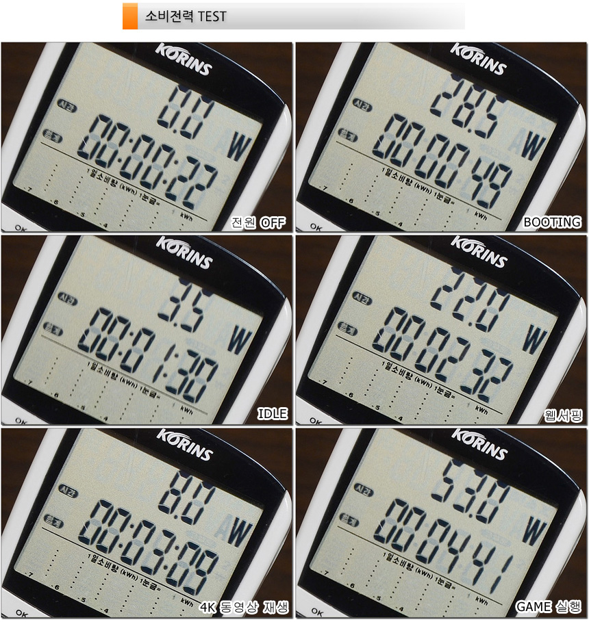 소비전력 테스트를 진행하고 있는 모습으로 (최고성능 모드) 캐주얼한 작업에서는 30W 이하의 낮은 소비전력으로 작동했으며 높은 성능을 필요로 하는 랜더링이나 게임에서는 53W 까지 소비전력이 올라가는 것을 확인할 수 있었다. (안전성을 위해 소비전력에 제한을 두는 일부 비즈니스 노트북과 달리 높은 성능을 필요로 할 때에는 소비전력도 높이는 모델이다.)