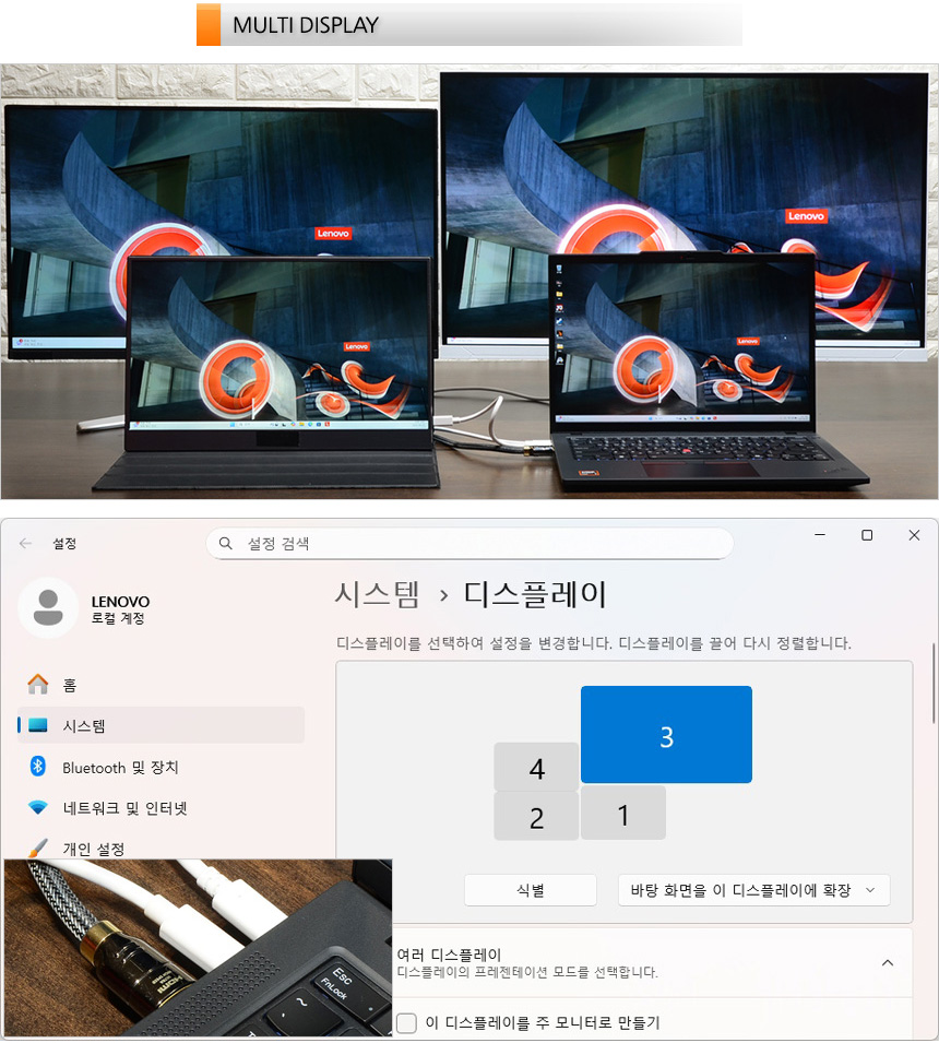 HDMI 뿐만 아니라 2개의 USB 4 단자가 디스플레이 출력 기능을 지원해 사진과 같이 3개의 모니터를 추가로 연결할 수 있다. 상단의 사진은 연결 테스트를 진행하고 있는 모습으로 4K 모니터도 정상적으로 작동하는 것을 확인할 수 있었다. 다중작업이 많은 업무환경에서 유용하게 사용할 수 있을 것이다.
